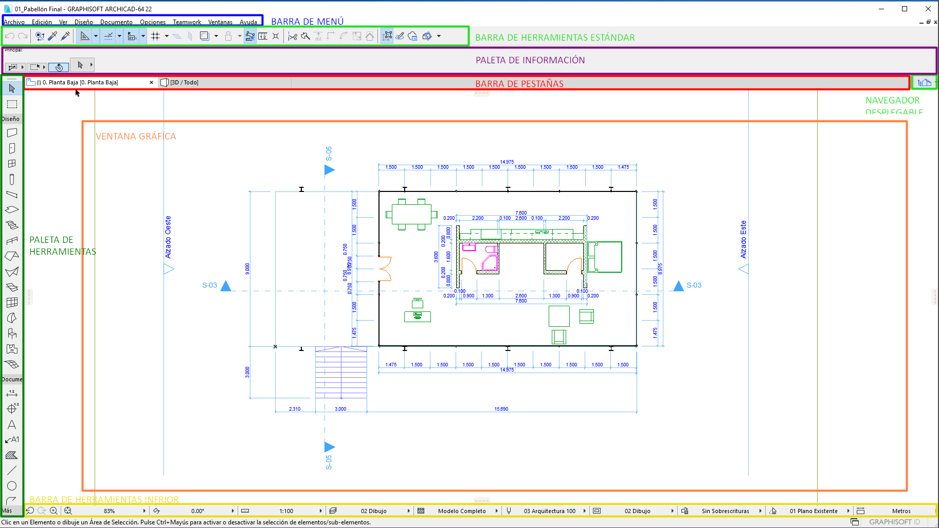 La parte central de la interfaz muestra el plano del proyecto.
