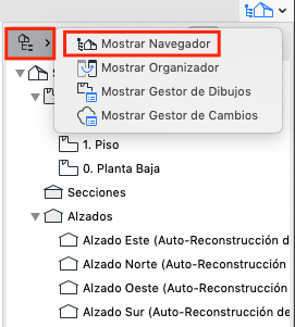 A la derecha, podemos ver el Navegador Desplegable, que lista todos los elementos del proyecto: aquí podemos saltar de una planta a otra o a diferentes vistas 3D, secciones, alzados y detalles del proyecto.